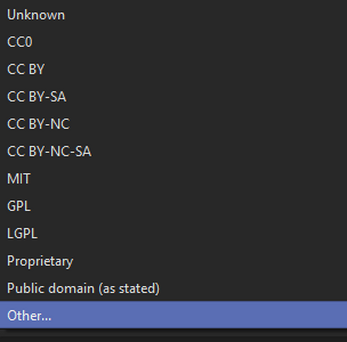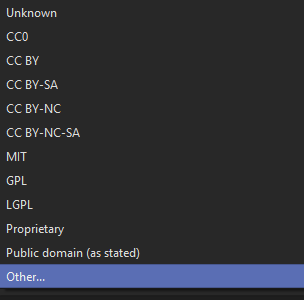 Supports common licenses (CC0, CC-BY, MIT, GPL, etc.) and custom ones.
